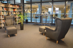 • Czytelnia ze strefą coworkingową – znajdziecie tu literaturę popularno-naukową, czasopisma, ksero, drukarkę, skaner, ładowarki indukcyjne, tablety, stanowiska z dostępem do Internetu, Wi-Fi, barek kawowy, stół konferencyjny, flipchart, kanapy i fotele